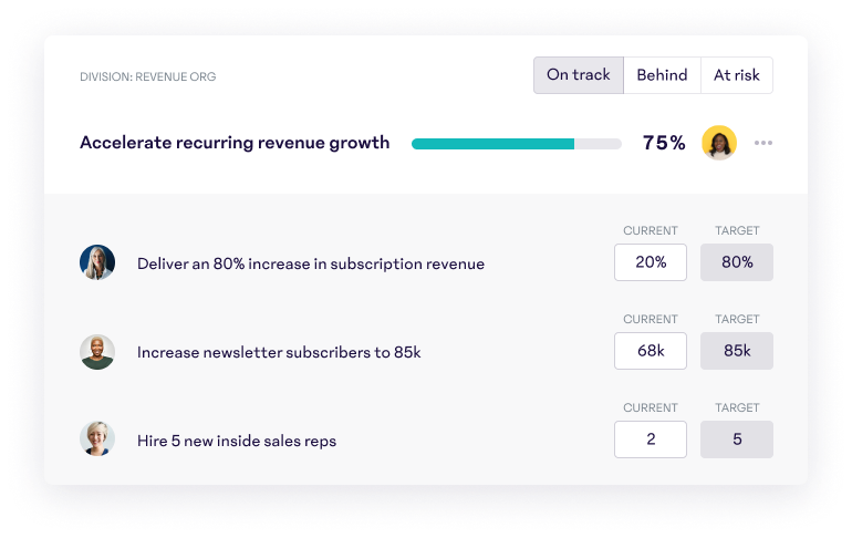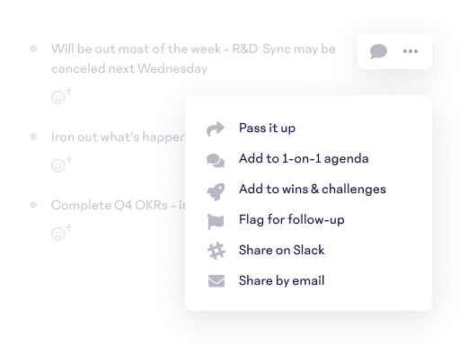 Check-ins uncover challenges, celebrate wins, and automatically track your team’s progress toward goals and OKRs.