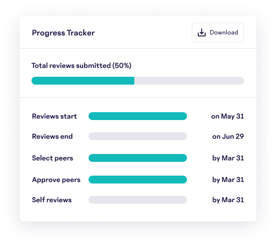 Track progress for each stage of your review cycle from nominating peer review writers to whether managers and peers have actually written their reviews. Quickly identify who may need a nudge to keep your performance cycle running on schedule.