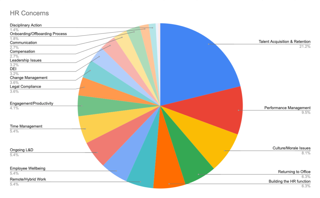 There were over 220 total responses, broken down into nearly 40 categories! Some of the concerns we saw were implementing performance management, career development, figuring out remote work, competencies, skills matrices, compensation, ongoing learning and development, and communication with the C-suite.