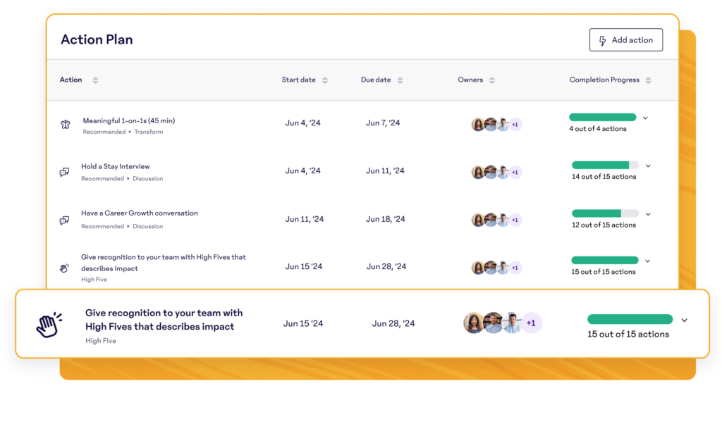 - Centralized, strategic action planning: Once HR leaders commit to a recommended course of action, they can organize their team’s efforts into coordinated campaigns aimed at specific HR outcomes. HR teams can assign specific strategic actions to relevant managers, including tailored 1-on-1 talking points or on-demand manager training aimed at specific skill gaps. From there, HR teams can track progress, hold people accountable, and measure impact.