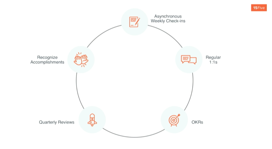Growth doesn’t happen overnight, and it certainly doesn’t happen without the help and buy-in of your team. By implementing a structure of workplace feedback, you’ll begin seeing a pattern of heightened productivity and excellent execution. 15Five found that asynchronous weekly check-ins, regular 1-on-1s, OKRs, quarterly reviews, and the recognition of accomplishments create a cyclical habit of success.