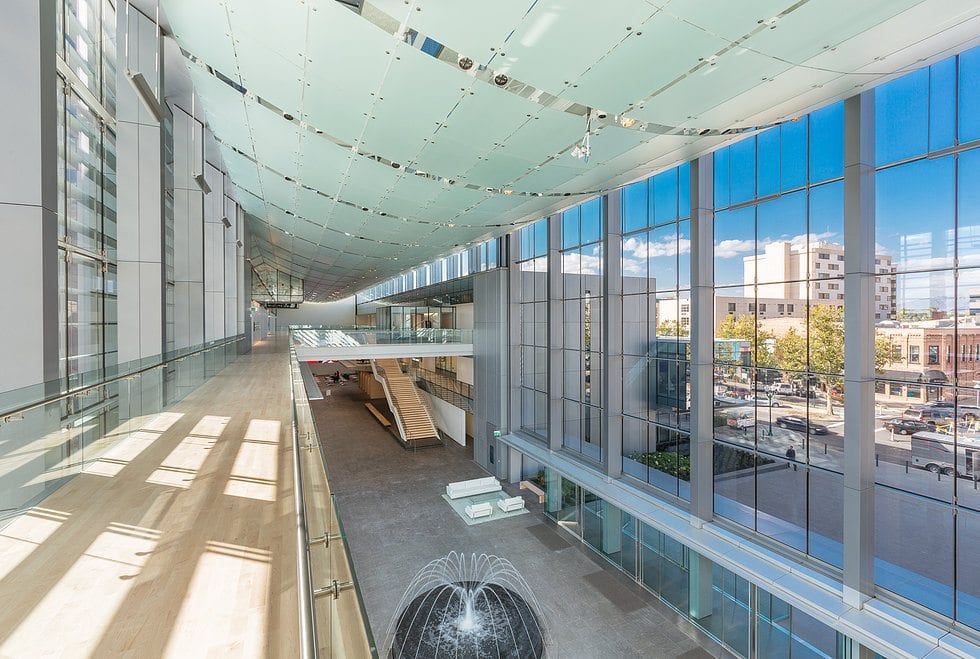 For example, take a look at 111 Main. The lobby of this beautiful office tower features unobstructed views through 35-foot-tall glass walls. Employees spent a full year preparing for the job: They trained, shipped glass from Germany, and developed custom equipment to install it: