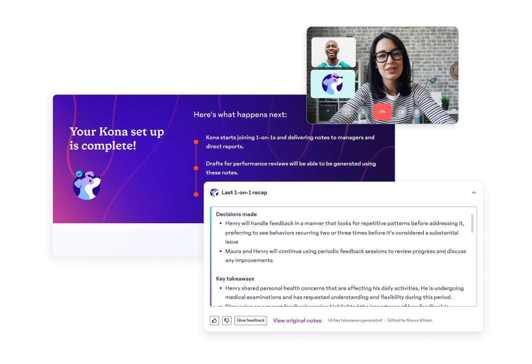 The only meeting assistant designed to preserve psychologically safe 1:1s. All participants can pause Kona's notetaking at any time and receive a copy of meeting notes.