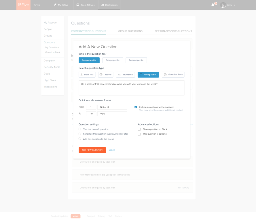 With our new metrics questions and dashboards we can provide greater value to businesses, especially on larger teams, where managers and executives need to understand trends and aggregated data for hundreds or thousands of employees. They can track these trends across teams or the entire organization, and then ask targeted open-ended questions of individual employees. Those questions become conversations, which in-turn become actions that impact employee performance and engagement, as well as business outcomes like revenue growth.