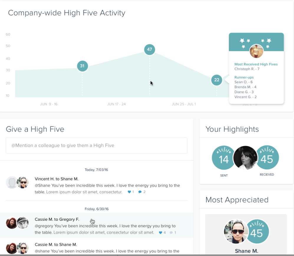 Employees simply @Mention a colleague and share why that person earned their praise over the past week. The High Five Dashboard displays all the High Fives throughout the organization, as well as who the top giver and receiver were in a given time period. This helps with morale and also lets managers easily pinpoint their rockstars.