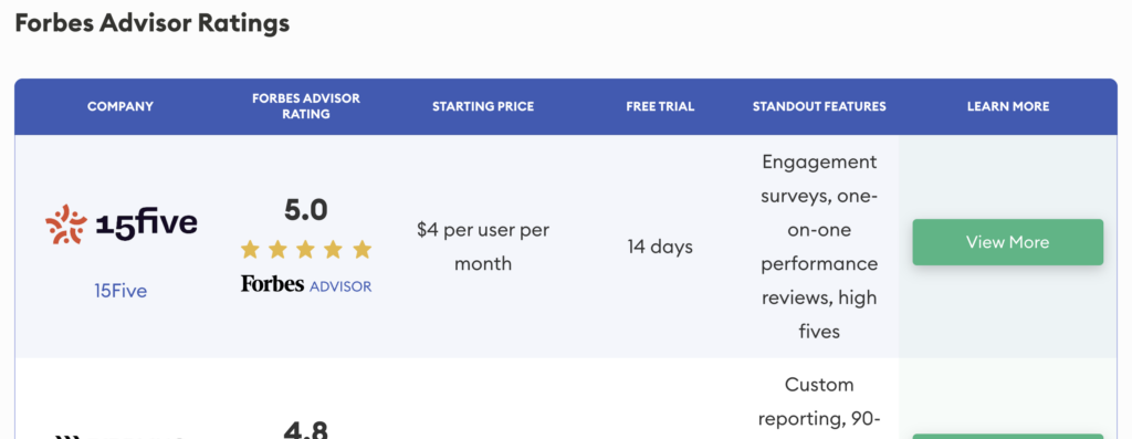 We are proud to share that Forbes ranked 15Five as Best Overall Talent Management Software for 2023! They are providing this analysis for HR teams to choose the right solution for their businesses to “achieve a productive, high-performing workforce.”