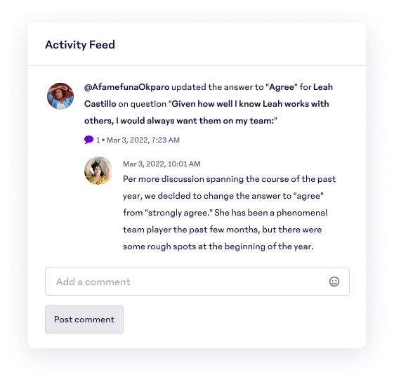 Collaboration in real time: Reviewers can adjust review answers, flag employees for discussion, and track changes with comments all in one place.