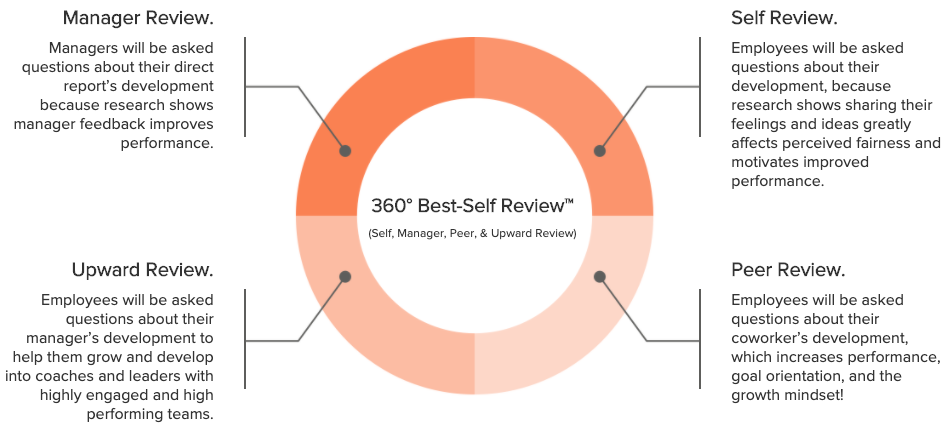 The Best-Self Review is a strengths-based, quarterly or semi-annual development conversation designed to ensure every team member is on a full-force, continued growth trajectory toward becoming their best self. Users can choose to either complete the 360° Best-Self Review which includes Self, Manager, Peer, and Upward Reviews or the Best-Self Review which includes Self and Manager Reviews only.